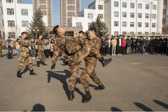 警卫中队的教官在格斗技能和内务整理两个方面给学生做了示范和指导。在拳术和技能格斗一系列展示中,教官们训练有素、动作整齐划一、口号气势雄浑,向学院师生展示了军人的风采和魅力。在学院的试点宿舍中,教官现场演示教学,包括叠被子、整理床铺、物品摆放等军事化宿舍内务要领。