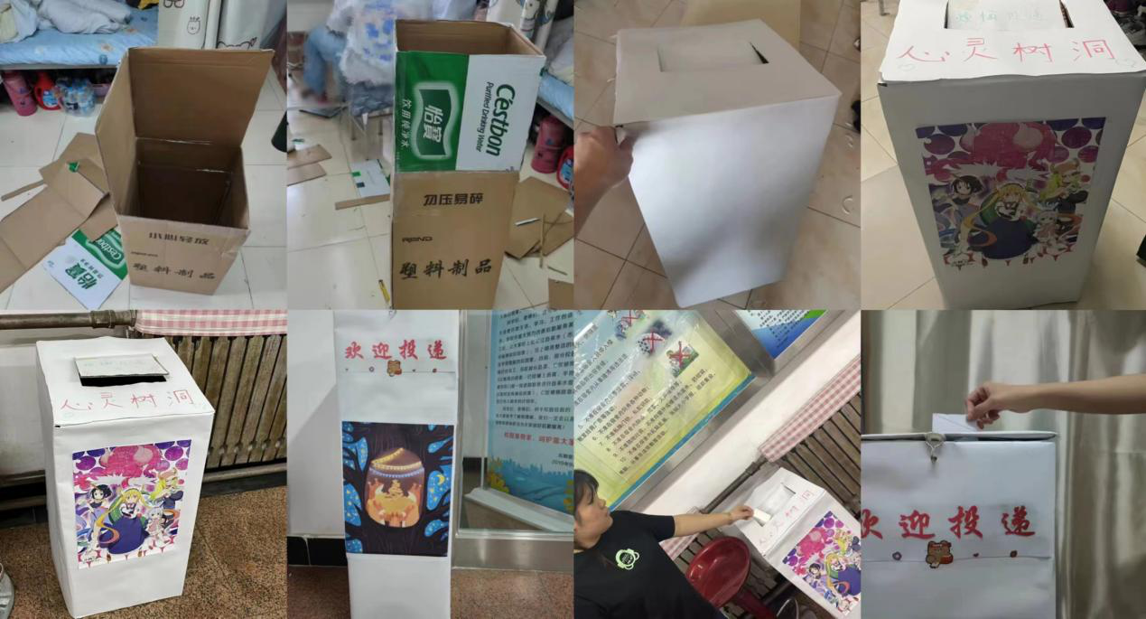 学生用回收消毒后的纸箱制作心灵树洞,就地取材,用心创造,经过同学们的裁剪、绘画、上色后改造成了一个又一个倾听同学们心声的树洞。制作完毕后,定点摆放在轻工学院101室(青心心理辅导工作室)前,让学生以匿名的形式投递烦恼。在保护学生隐私的情况下,根据学生投递的问题,青心心理辅导站提出建议并给予帮助。心灵树洞活动使同学们在校园中的烦恼得以释放,同学们通过树洞将自己的烦恼和不开心的事情倾诉出来,不被负能量影响,在疫情期间坚守住自己的“心灵绿码”。