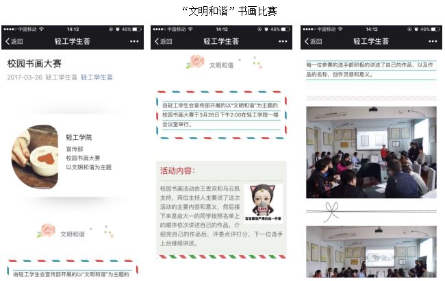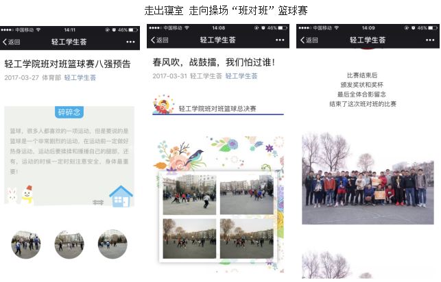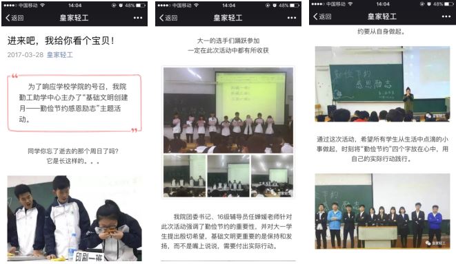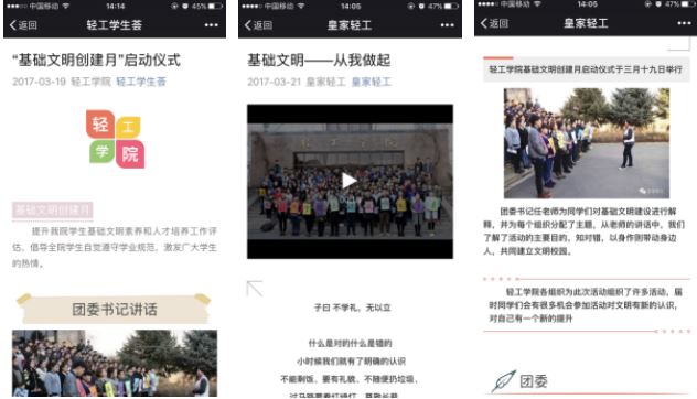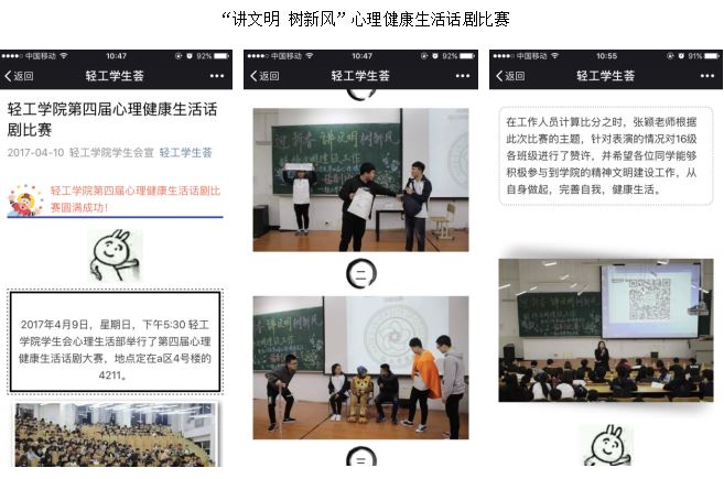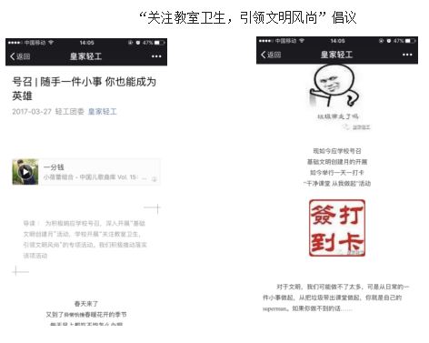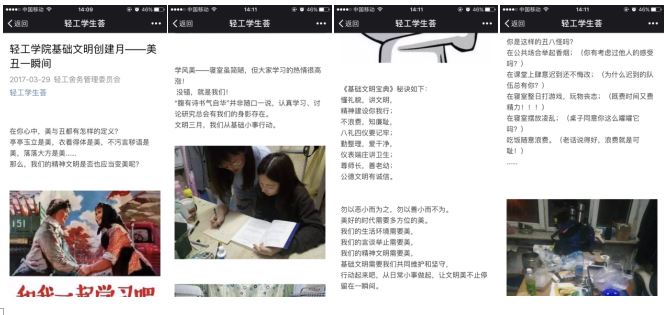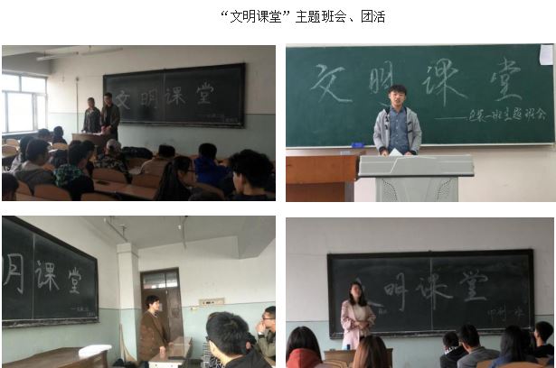 在学生团委负责的“文明课堂”版块,我们安排了以“文明课堂”为主题的班会或者团活,各班结合自己班级实际情况,自定形式,注重实效。大一辅导员老师也深入班级参加活动,与同学们共同探讨如何还大学课堂以文明。另外,在校学工部(处)、校团委关于“关注教室卫生,引领文明风尚”的共同倡导下,我院“皇家轻工”微信平台也及时对同学们提出号召,“随手一件小事,你也能成为英雄”,受到了我院学生的广泛关注和行动上的积极配合。