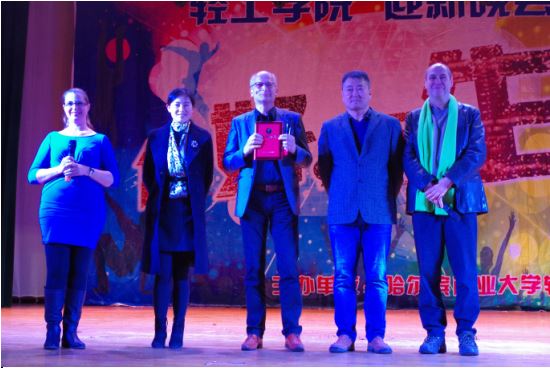 晚会期间,荷兰英荷大学师生的亲临现场,为晚会掀起一个高潮,郑大宇院长用流利的英语为台下同学介绍了到访的客人和交流互访的情况,潘鹏杰书记为他们颁发了友好交流荣誉证书,英荷大学的Egbert先生表达对学生的问候。