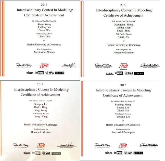 2017年美国国际大学生数学建模竞赛(MCM)与交叉学科建模竞赛(ICM)大赛中,轻工学院学生取得了辉煌战果和历史最好成绩,其中:王斯瑶、于瑞凤、吴大涛三位同学获国际一等奖;张光倩、 陈立影、卢水根同学获国际二等奖;孟凡宁、刘思彤、马心蕊同学获国际三等奖。
