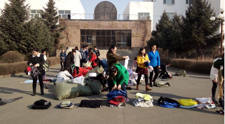 3月26日上午八点,爱心社的同学们在轻工学院门口将衣物分类整理装袋。在爱心社社长宋美蓉、副社长王玥及各个部长的带领下,志愿者们积极工作,短短一个多小时便完成了整理工作。整理完毕后,同学们带着衣服到银河小区开始了爱心义卖活动。