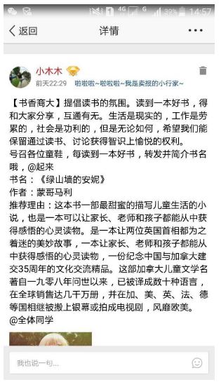 活动由学院团委发起,同学们经过一番比较、商榷,选出一些优秀的有深度的图书,并在当下影响大、传播快的微信平台和QQ空间上发布出来,推荐同学们积极阅读。同时号召同学们每读到一本好书,就转发评论并介绍该书,这样一点点的转载会积累下许多好书,让同学们“有书可读”。此次宣传效果非常显著,通过平台可以看到,许多同学积极参与,分享自己的读书习惯与读书乐趣,不仅读到了书还交到了许多朋友。同时我们还利用微博平台开展了相关话题的讨论并呼吁大家走进图书馆,共享读书的乐趣。