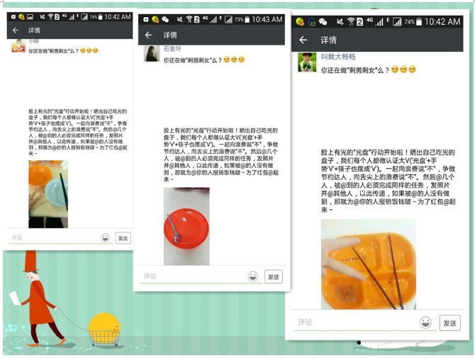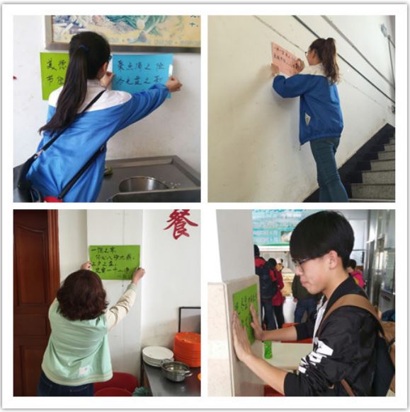 此次宣传活动,我们从如今最火热的微信朋友圈出发,每天坚持推送“光盘”照片,倡导身边的人加入“光盘行动”。宣传效果非常显著,同学们热情高涨,坚决不做“剩男剩女”。为了再次提高活动的宣传力度,轻工团委精心制做“光盘行动”宣传标语,张贴在食堂各处。我们的宣传标语时刻提醒着同学们“一米一粟来之不易,勤俭节约从我做起”。