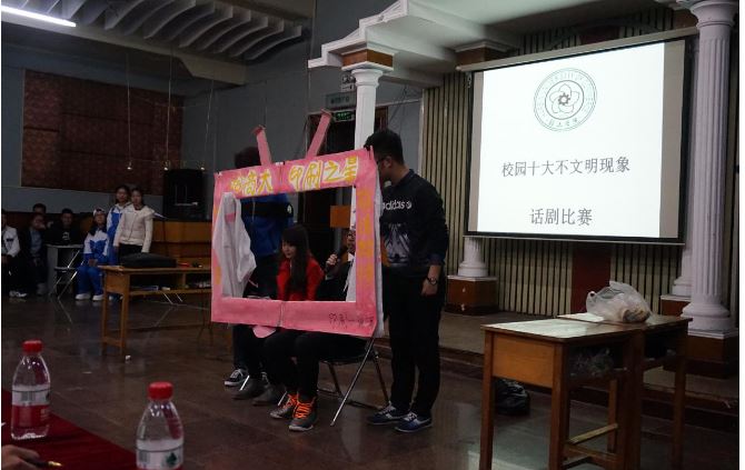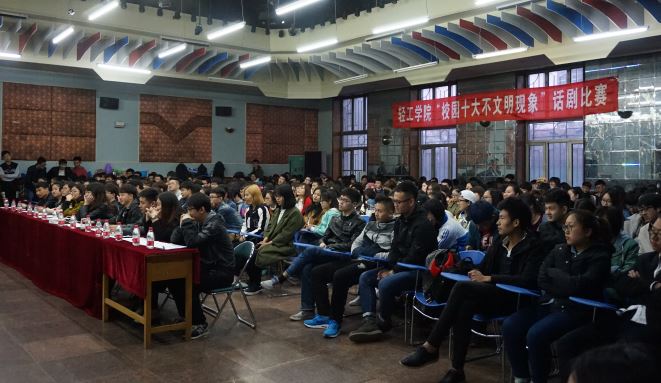 轻工学院“基础文明创建月”系列活动之“校园十大不文明现象”话剧比赛于4月9日如期举行,此次“校园十大不文明现象”由学生在微信公众平台投票产生,15级全体学生参加投票,得票最高的、最不文明的校园现象为“上课不听课,低头摆弄手机”。十种校园不文明现象,由15级十个班级的学生以话剧形式再现,让同学们深刻反思。