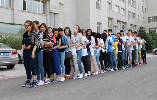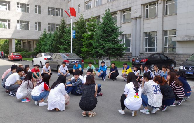 为了更好地将理论与实际结合,在室内培训结束后,团委成员又进行了室外的实践活动。在扔手帕游戏中输的人,要接受惩罚,四位输家背靠背蹲在地上,凭借互相依靠共同站起来,除了背部之外的部位都不允许有接触,这极大地考验了四个人相互之间的信任。随后是拉红绳活动,八个女生闭眼把红绳拉成正方形,这是对默契的考验。手拉手挑衅活动体现了大家的协作与勇气。最后一个活动是反转小鸡抓老鹰,几个小鸡共同携手抓住老鹰,这体现了只要共同努力,再小的力量也可能创造大奇迹。两个小时的室外培训活动在大家的欢声笑语中圆满结束。