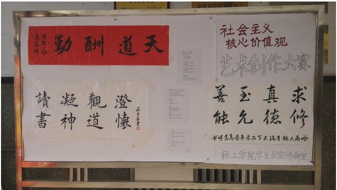 3月20日至29日,轻工学院举办了为期十天的“我为核心价值观代言”书画艺术创作大赛。各年级学生积极参加,用自己的艺术语言表达对社会主义核心价值观24字的理解。在初赛的众多参赛作品中,我们选出10幅优秀作品给予单项奖,这10位作者进入决赛。决赛由院团委书记任婵媛、兼职辅导员赵丽丽及学生会、学生团委、舍务管理委员会、勤工助学办公室各学生组织负责同学担任评委。