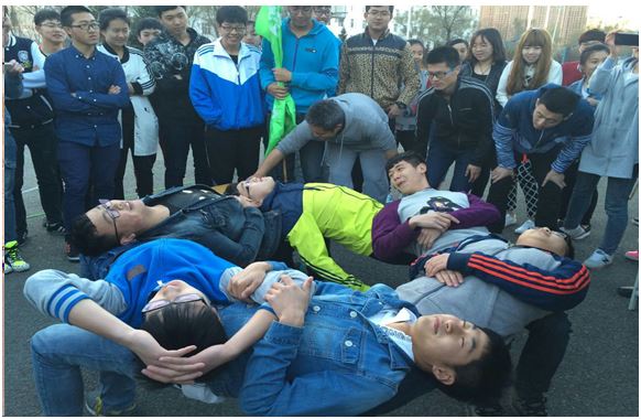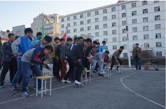 本次活动分为四个环节:第一个环节为分组定口号,学生分成四队,在规定时间内定下各组口号。第二个环节为乒乓球接力,每队十人,男女各五人,站在场地两端,用筷子夹住杯子中的乒乓球,运送到对方的杯子中。第三个环节为撤凳子,各组六名队员坐在凳子上,后背躺在后面同学的腿上,规定时间内准备好,撤去凳子,每个人保持撤去凳子前的姿势。第四个环节为“守护女王”,每队四名男同学和一名女同学,男生在保护女生的同时,用排球击中对方“女王”,场地内外队员需要齐心协力,精诚合作,团结一致完成游戏。