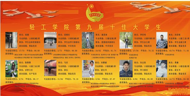 11月下旬,轻工学院团委启动了第九届“十佳大学生”评选活动。本项评选是我院为了进一步推进大学生思想政治教育工作,宣传和树立青年学生典型,展示我院优秀大学生风采而创办的特色活动,至今已经九届。本届评选通过班级推荐、个人自荐两个方式,共有28名同学报名。这28名同学既在思想品质、学习、工作、社会实践等各方面都有良好的综合表现,又在某一方面有特别的突出成绩,符合参选标准。