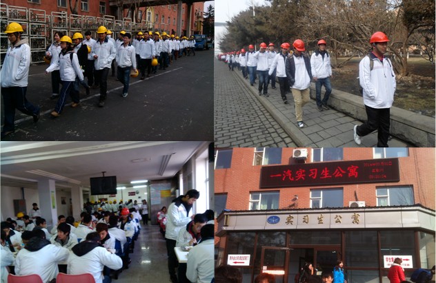 2014年春节过后开学的第一天,轻工学院机械和工业工程专业的188位同学在马丽心教授等一行8人的实习小分队的带领下,怀着激动和兴奋的心情,在无尽的企盼和憧憬中,来到了拥有员工11.8万人,资产总额1314.91亿元的国内最大的汽车企业集团-----中国第一汽车股份有限公司完成为期两周的生产实习教学任务,生产实习是培养方案中一个极为重要的实践性教学环节。通过实习,能使同学们在社会实践中接触与本专业相关的知识,增强感性认识,培养和锻炼学生综合运用所学的基础理论、基本技能和专业知识,去独立分析和解决实际问题的能力,提高实践动手能力,为毕业后走上工作岗位打下一定的基础。入厂前的安全培训让同学们更加感受到生命的脆弱与宝贵,之后的每天清晨,大家都踏着朝阳、迎着寒风行进在上工的路上。