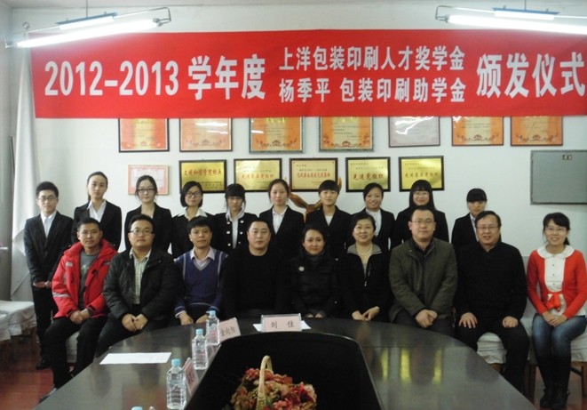 2014年3月11日下午2点,2012-2013学年度上洋包装印刷人才奖学金、杨季平包装印刷助学金颁发仪式在轻工学院会议室隆重举行。仪式由2010级辅导员刘佳老师主持。哈尔滨上洋包装制品有限公司经理冯建茹女士亲临颁发仪式现场,轻工学院院长杨绮云教授、党总支书记张春明副教授、副院长金向阳副教授、党总支副书记张铁锋副教授及包装工程、印刷工程教研室全体教师也出席了此次颁发仪式。