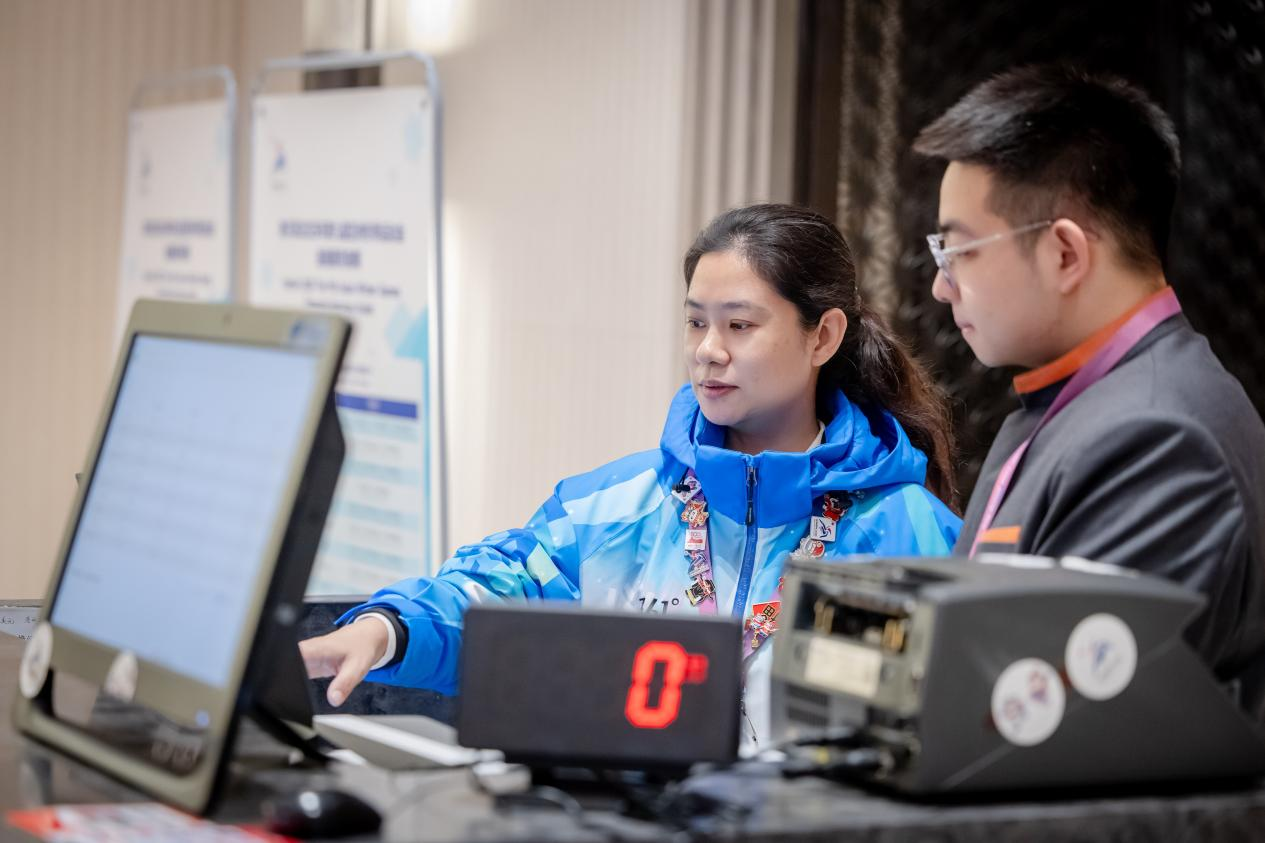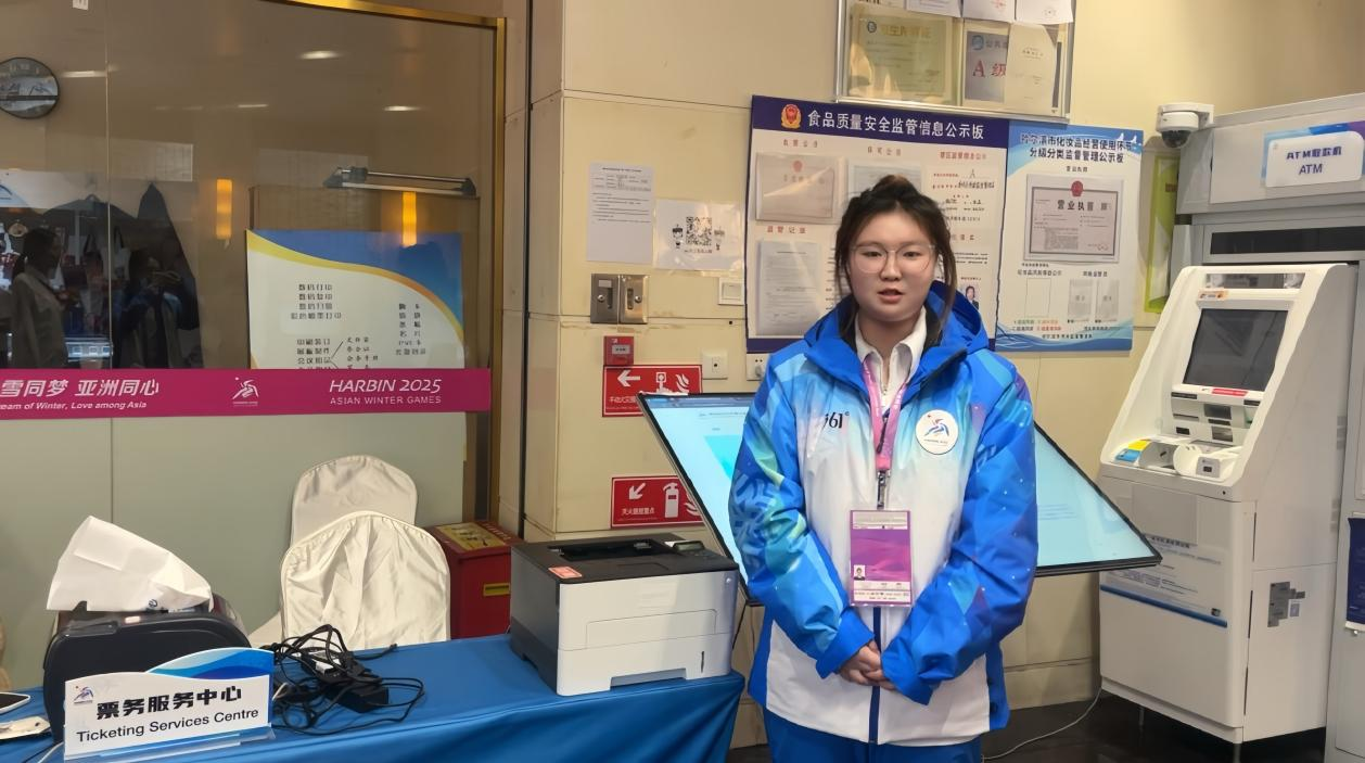 香格里拉酒店和北大荒国际饭店运动员分村的志愿者们主要工作的点位是票务前台,他们根据赛事票务系统,为运动员及随行人员(如教练、家属)介绍赛事安排、购票流程、提供订票服务,协助处理运动员亲友团的团体票预订或座位集中需求,协调解决因语言障碍、系统故障或支付问题引发的购票困难。