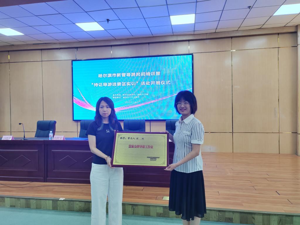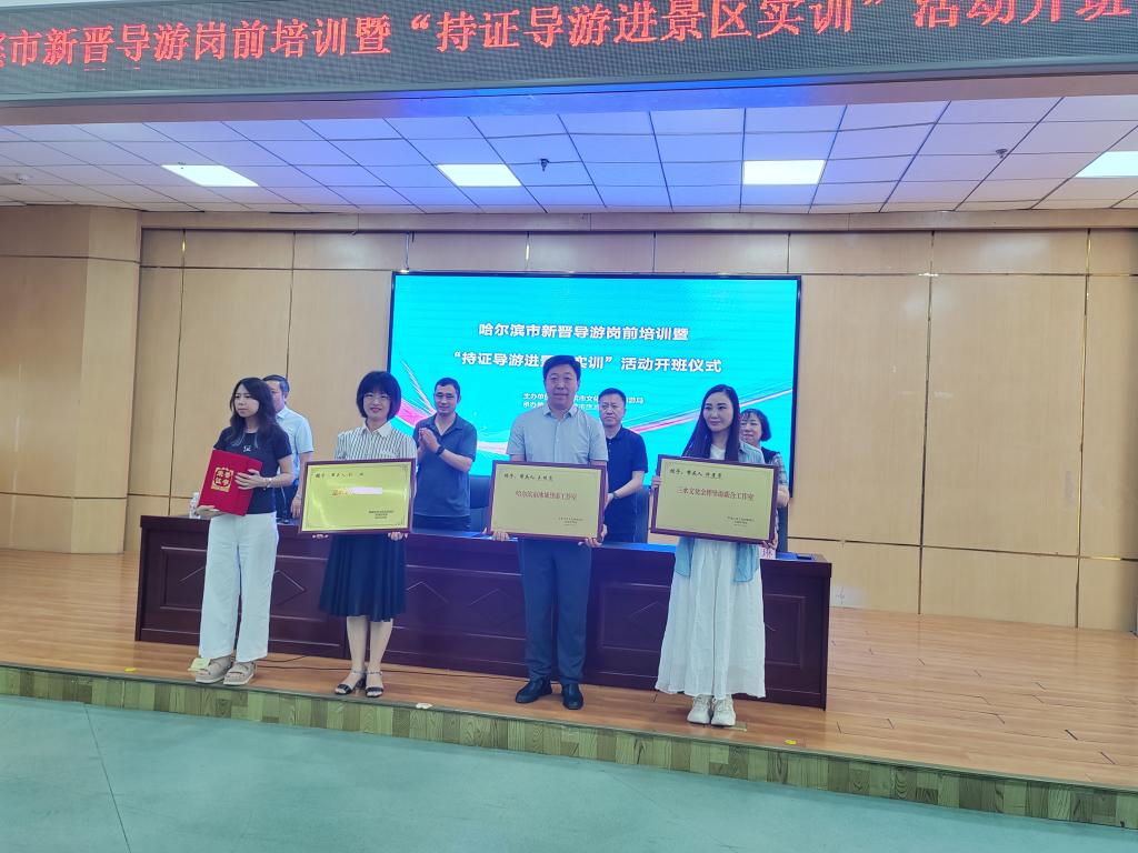 为进一步加强导游队伍建设,6月25日,哈尔滨市文化广电和旅游局在哈尔滨市新晋导游岗前培训暨“持证导游进景区实训”活动开班仪式上,为2023年“龙江金牌导游”和“金牌导游”工作室进行授牌。旅游烹饪学院副教授刘琳作为慧旅金牌导游工作室的带头人,参加了授牌仪式,并上台领奖。