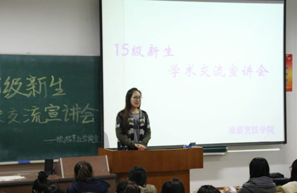 为了帮助2015级新生尽快适应大学的学习生活,明确大学期间的主要任务,树立远大的学习、生活目标,积极营造严谨勤奋的学习风气和团结友爱的生活氛围,顺利、平稳、有效地实现从中学到大学的转变,以昂扬向上的精神风貌迎接崭新的大学生活。2015年11月3日晚上5点,旅游烹饪学院2015级新生学习经验交流会于前楼410隆重召开。本次交流会由院学生会学习部部长丛来欣同学主持,辅导员杨晶老师、学生会主席姜雨博同学、12级王艳、13级杨露鹭、14级兰红梅和张雨晴等同学代表发言,2015级新生参加了此次活动。