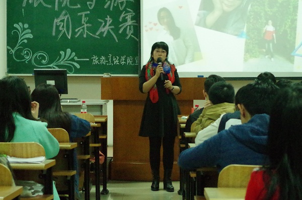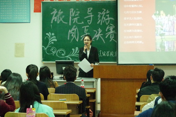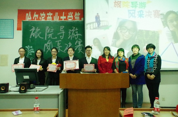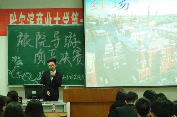 2016年3月28日晚五时许,哈尔滨商业大学旅游烹饪学院第十届导游风采大赛于南校区前楼407教室正式拉开帷幕。担任此次大赛评委的有院团委书记毕军老师,院团委副书记杨晶老师,旅游专业教师朱正杰老师、汤姿老师。此次比赛吸引了各年级数十名学生参加,经过层层选拔,共有五名进入决赛的选手,分别为舒欢、吕子越、李紫娟、张瑞云、谭明龙。本次大赛旨在提升我院学生导游技能水平、文化底蕴和综合素质,为热爱旅游事业的同学们提供一个展现自我、发现自我、了解自我的平台。