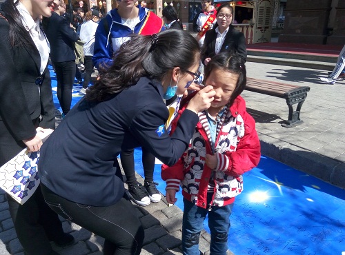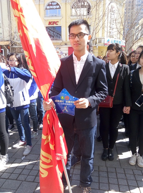 十点整,在中央大街进行的万人签名活动正式拉开帷幕,我院志愿者服务小分队的同学们首先在倡议条幅上签下自己的名字,并向社会群众宣传并呼吁大家关爱自闭症儿童,滴水汇成河流,满条幅的关爱使孤独症患儿感到温暖和不孤单。晚7点整,关爱孤独症文艺汇演于哈尔滨龙塔正式开始,黑龙江省各电视台主播、著名流行音乐人以及孤独症康复儿童带来的诗朗诵和经典歌曲演唱等节目,牵动着现场每个志愿者的心。晚八点整,在千万人的共同瞩目下,蓝灯被点亮,绽放出迷人的蓝色光芒,与几百名志愿者和社会人士手中的蓝色荧光棒交相辉映,现场成为一片蓝色的海洋。我院志愿者们与自闭症儿童一起,共同见证了这历史性的一刻,蓝色是来自“星星的孩子”的颜色,它代表着一份纯真和一份纯净,希望这样一束束蓝光能够照亮这些孩子们的未来。