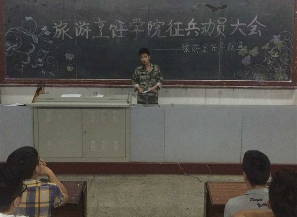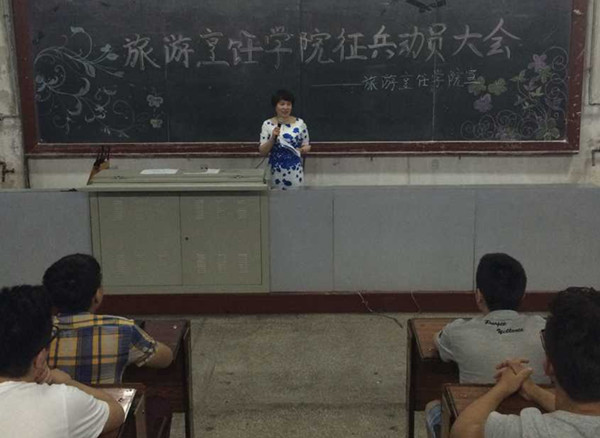 2015年6月16日12:30,在综合楼J021教室,旅游烹饪学院召开大学生征兵入伍动员大会,院党总支副书记李晓阳老师、团委书记毕军老师出席了本次大会,学院12级、13级、14级全体男生参加了大会。动员大会由李晓阳老师主持,参军复员学生马建勋作为参加学生代表给全体男生们讲述了军旅生活的酸甜苦辣和感悟收获。