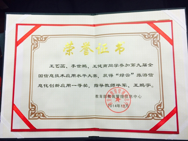 来自哈尔滨商业大学旅游烹饪学院的参赛队伍不畏强手,充分发挥自身专业知识扎实,实践能力强的特点,最终以精心缜密的设计,极具创意的构思和齐心协力的团队精神,取得优异的成绩。王艺菡、李世鹏、王健南获得全国信息技术应用水平大赛“绿云”旅游信息化创新应用一等奖,毕军、王鹏宇获得最佳指导教师奖。