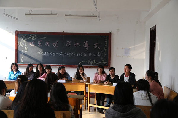 经验交流会现场挤满了人,现场气氛很是活跃。孙静院长首先向考研的同学们介绍了近几年我院考研的情况,她对10级考研学生取得的优异成绩给予了高度肯定和深深祝贺,指出10级是我们近几年考研数量、质量最好的,充分体现了同学们热爱学习,勇于进取的精神,学院领导、老师也都非常重视学生们的考研情况,接着深入分析了当下的考研和就业形势,鼓励同学们要调整好心态,合理定位,坚定信念,努力拼搏,最后对准备考研的同学送上了衷心祝福。