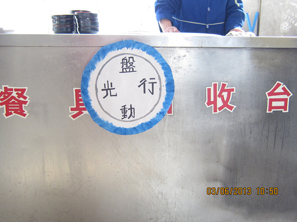 为大力弘扬中华民族勤俭节约的优秀传统,宣传节约光荣、浪费可耻的思想观念,努力使厉行节约、反对浪费在学校蔚然成风,旅游烹饪学院青马工程学习实践小组在指导教师、马克思主义哲学专业在读博士杨晶老师的带领下,于2013年3月6日中午在南校区一食堂二楼举行了以“光盘行动,从我做起”为主题的活动,得到了南区各学院同学们的积极响应,取得了良好的效果。