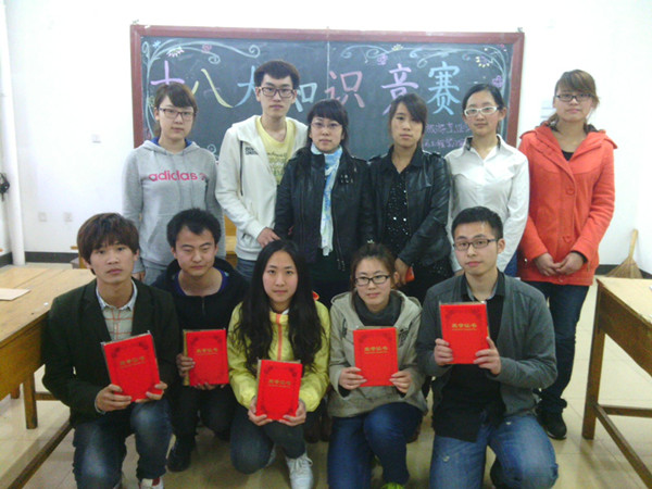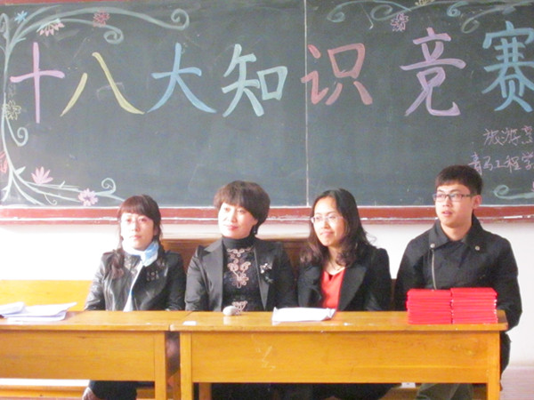为深入学习贯彻党的十八大精神,积极促进大学生思想进步,4月22日下午5时,旅游烹饪学院“青马”工程学习实践小组在学院办公楼202室,举办了“十八大知识竞答”学习活动。党总支副书记李晓阳老师、“青马”工程学习实践小组指导教师杨晶老师、刘淑萍老师以及“青马”工程学习实践小组的全体成员参与此次竞答活动。