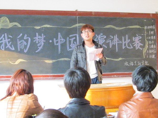 担任此次比赛的评委有团委书记毕军老师,三位学生会副主席以及学习部部长。在由主持人简单介绍比赛规则及具体要求之后,比赛正式开始。选手们按顺序依次登台,11级旅游管理的徐丹以自己作为一名当代大学生的角度阐释了“中国梦”所赋予我们青年人的历史使命;12级旅游管理的杨树玉则言语朴实,感情真挚,将中国梦的理解贴近到我们每一个人的梦想当中;12级旅游管理的王健南则是通过讲述自己从小到大不同的梦想开始 ,并引出经典论点“我的梦就是中国梦”,博得现场的一阵掌声。12级烹饪与营养教育的孙健则是从讲述中国坎坷不屈的历史开始,从讲述中国人的追梦历程开始,他时而义愤填膺,时而语调舒缓,说到激昂处不禁捶胸顿足。他的精彩演讲将现场气氛推向高潮并得到评委的一致好评。经过激烈的角逐,孙健、徐丹、王健南摘得前三。