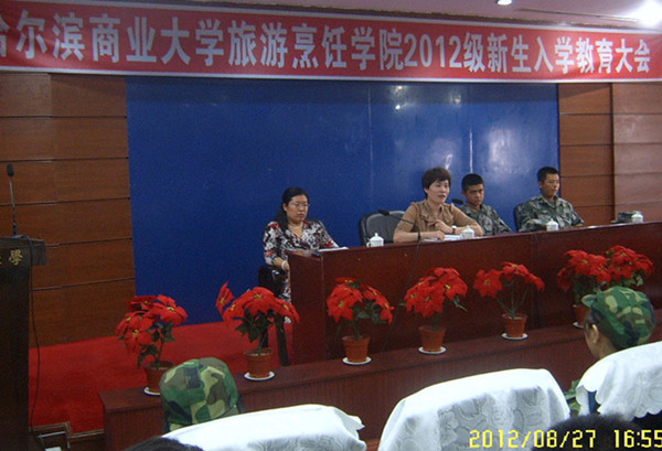 2012年8月27日下午3点整,旅游烹饪学院2012级新生入学教育暨军训动员大会在商大酒店会议厅隆重召开。出席本次大会的有旅游烹饪学院党总支副书记李晓阳副教授,2012级新生辅导员汪晓梅老师,担任军训任务的沈阳军区老虎团的两位优秀教官以及我院2012级全体新生。大会由汪晓梅老师主持。