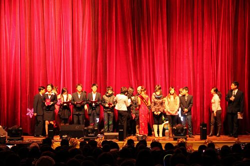 5点整,南区学生会堂已经座无虚席,过道上也站满了学生。在追光灯下,学院领导和老师们依次走上舞台,全场响起了热烈的掌声。石长波院长、李晓阳副书记以及老师们为在2010年度表现优异的学生们颁发证书,获得学院2010年度学院职业规划大赛的前十名同学以及获得学院学习之星、社团活动之星、志愿服务之星、礼仪之星、严谨自律之星、计算机之星、乐业奉献之星、体育之星、文艺之星、自强自立之星的同学在热烈的掌声中走上舞台,接受老师和同学们的祝贺。在校运动会上取得优异成绩的运动员代表也从石长波院长手里接过了奖金。