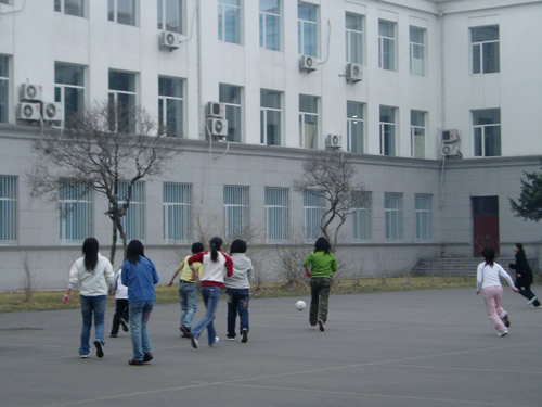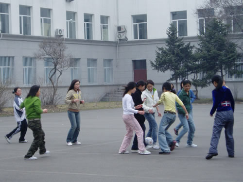 这次比赛可以称得上是一次比较特殊的比赛,因为从人数上来看,每队只有8名球员,其中场上踢球的队员有7名,清一色女生,一名守门员为男生,别看上场的人少,也别看踢球的都是女生,她们踢球的那股热情绝不亚于国家女足。一个小小的足球从这边踢到那边,从那边又传回这边,场面实在很激烈。但同时两队还非常友好,球员不小心碰到了另一名球员,马上道声“对不起”,另一名球员也微笑着说“没关系”,这可真是充分的体现了那句口号“友谊第一,比赛第二”。