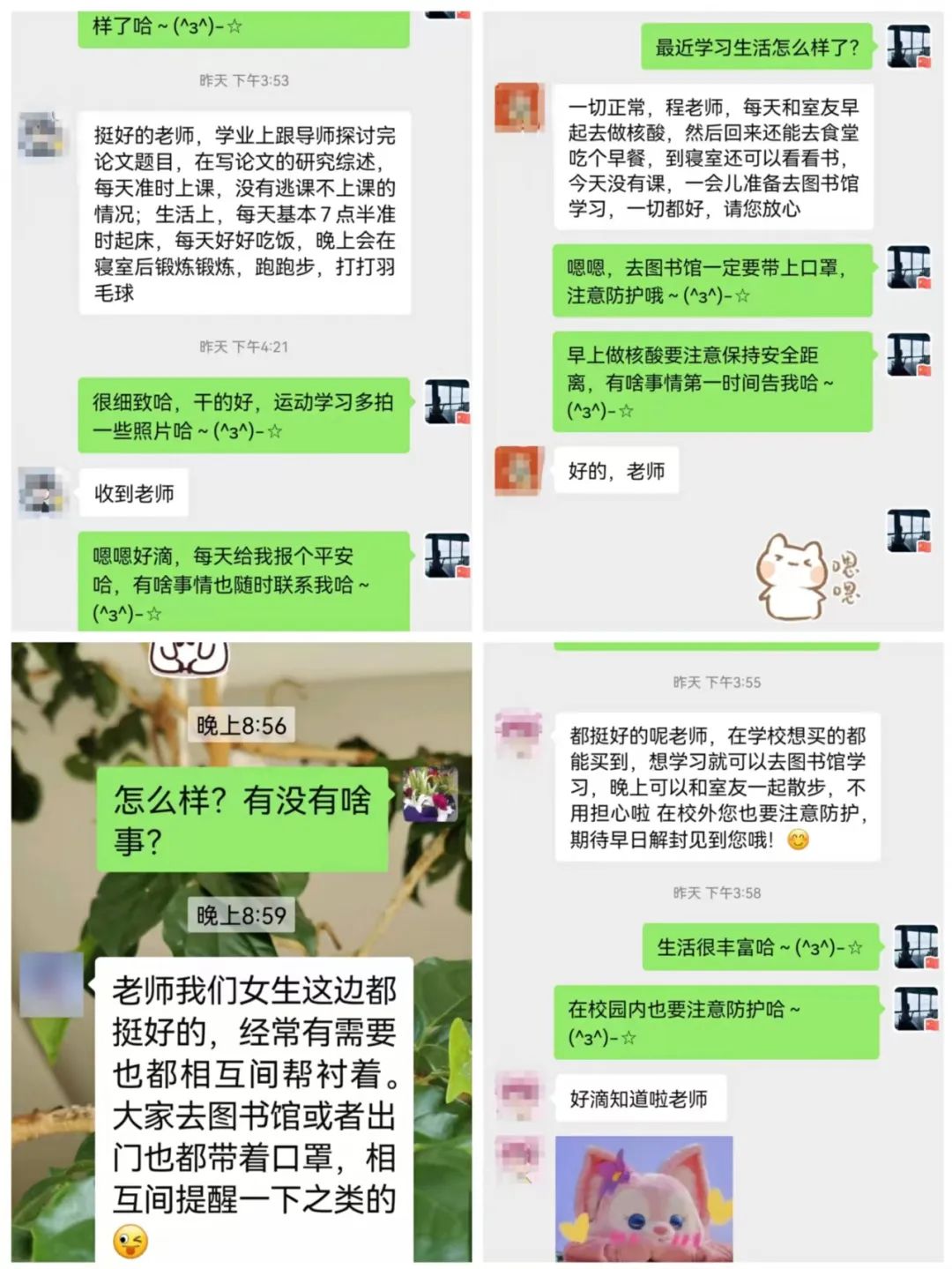 一个电话拉近距离,听见你的声音,我们就很安心;一条微信你来我往,了解你的生活,我们就很开心;一次视频云端相见,看见你的身影,我们就很放心。从每天的沟通中可以看到师生之间的相互关心,可以看到同学们对学校防疫措施的肯定,可以看到同学们对线下教学的期望。