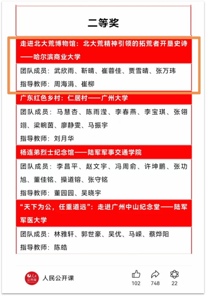 本届大赛吸引众多团队参赛,共征集来自24个省(市、自治区)200余所高校提交的700余个作品。经过高校专家评委、博物馆专家评委、社会专家评委、中小学专家评委、资深媒体评委、大学生评委等多轮评审,哈尔滨商业大学马克思主义学院出品的《走进北大荒博物馆:北大荒精神引领的拓荒者开垦史诗》最终在374个获奖作品中脱颖而出,荣获全国二等奖。