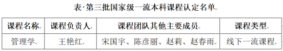 近日,教育部高等教育司发布《关于第三批国家级一流本科课程认定结果的公示》,由商务学院王艳红副教授负责的《管理学》课程被认定为国家级一流本科课程(线下一流课程),充分展现了学院在本科课程建设方面取得显著成效。