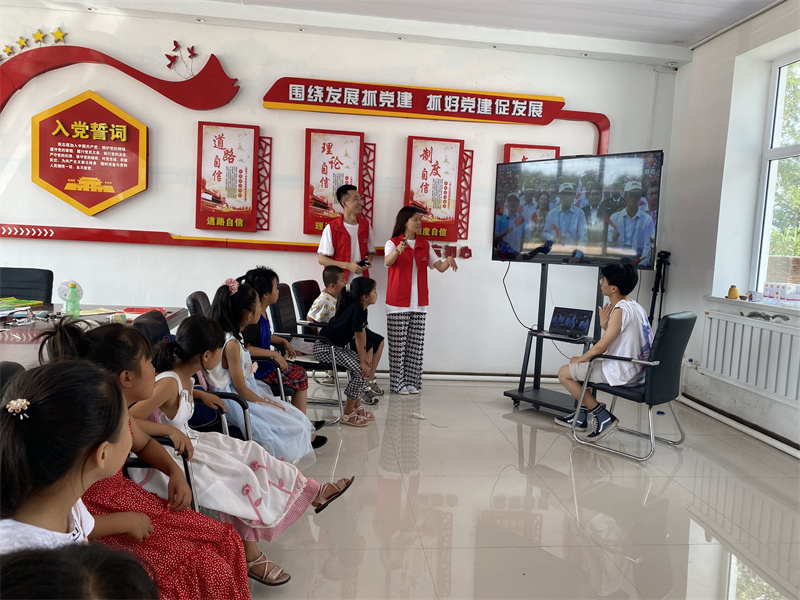 除此之外,为了让孩子们深入了解党的百年光辉历程,弘扬和传承党的优良传统,厚植爱党、爱国、爱社会主义情感,志愿者们还特别设计了红色歌曲传唱、观看庆祝中国共产党成立100周年大会、红色诗词朗诵等红色文化教育课程,并依托志愿者中的“青马工程” 大学生党史宣讲团成员,围绕东北四大精神之一的东北抗联精神进行党史宣讲,通过让孩子们了解革命前辈在艰苦卓绝的环境中浴血奋战的艰辛历程,培养孩子的爱党爱国情怀,让红色基因、革命薪火代代相传。