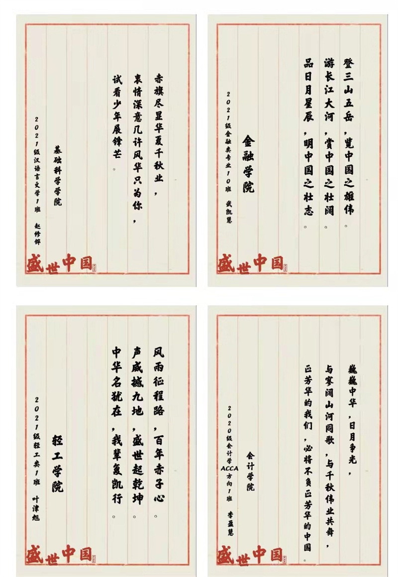 在全校师生同心协力抗击疫情之时,恰逢国庆节,校团委以此为契机,开展了“同心庆国庆 共诉爱国情”线上系列活动,将我校青年学子在同心抗疫过程中凝结的浓厚爱国、爱校情感,以我和国旗合个影、三行诗创作、红色歌曲视频录制的形式表达出来,进一步增强广大青年的爱党、爱国、爱社会主义情感,提升青年学生的民族自尊心、自信心和自豪感,同时,引领青年学生把爱国主义情怀具化为勤于实践、勇于担当的实际行动,让彰显着爱国主义光辉和抗疫精神的旗帜始终高扬在这个难忘的金秋。自活动开展以来,全校学生积极参与,热情投稿,收到摄影作品253件、三行诗歌作品230篇、视频作品45件。