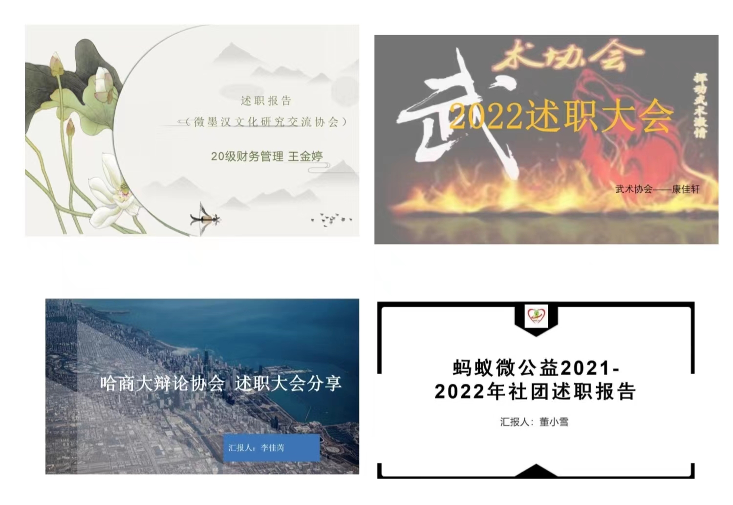 本次述职工作会议,结合我校校级学生社团的实际工作情况,采取现场述职与书面述职相结合的方式,蚂蚁微公益、武术协会、摄影协会、徵墨汉文化研究交流协会、CrazySky英语晨读社团、哈商大辩论协会、馨苑助学、膳源中医社团、允能社、聚星英语口语社团10个学院社团负责人进行现场述职,其他学生社团进行书面述职。各学生社团负责人代表本社团,围绕社团活动开展、成员管理、组织建设等方面,认真梳理总结了工作成效、分析了存在的短板弱项。会后,大家纷纷表示,作为本届校级学生社团负责人,将继续发挥传帮带的传统,将好的工作经验、方法传递给下届负责同学,为促进我校社团的健康规范发展贡献力量。