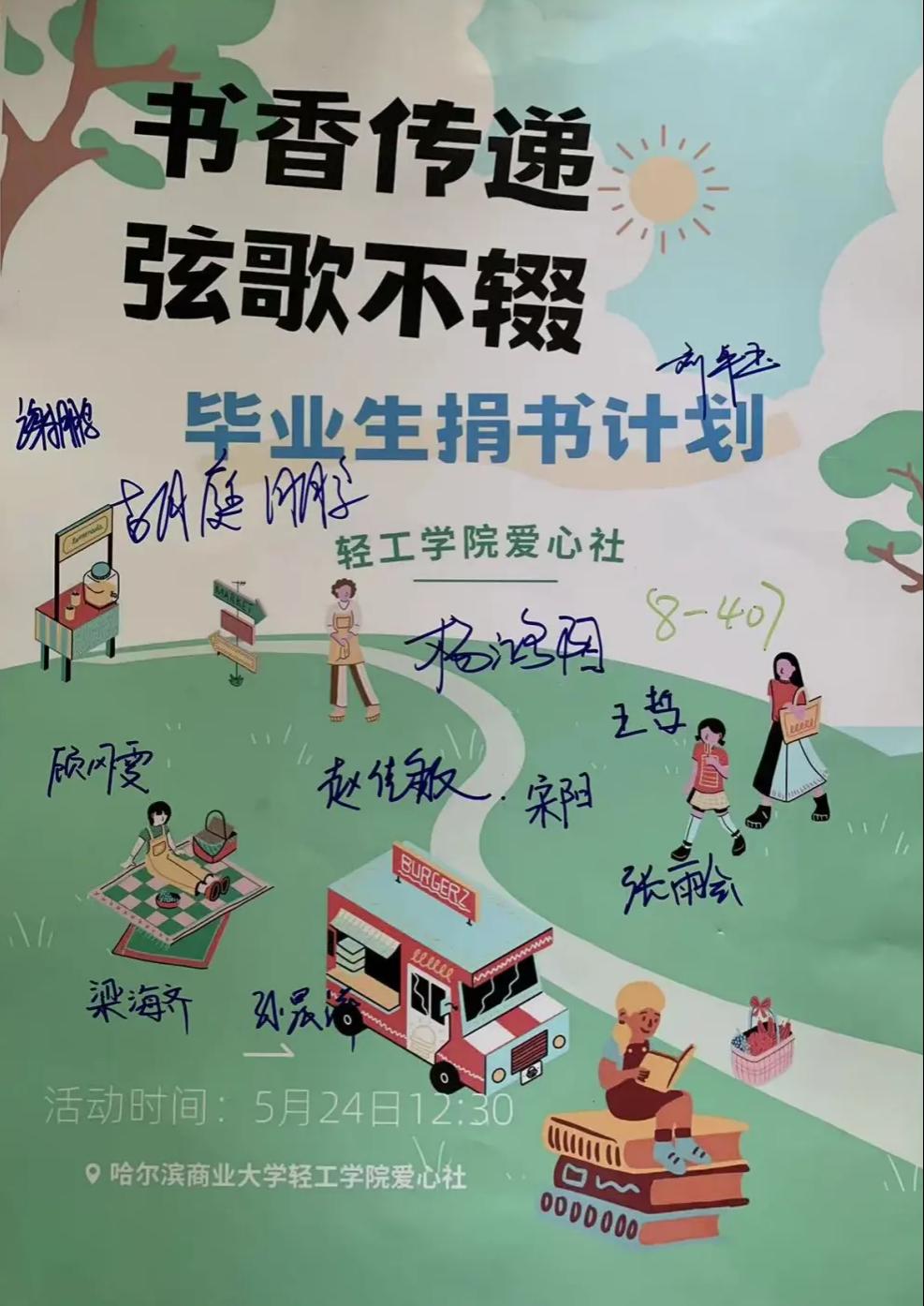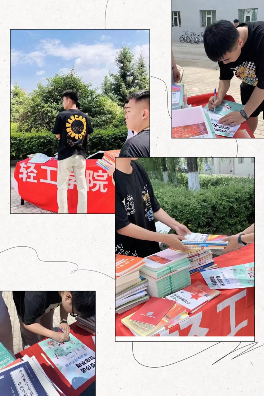 予人玫瑰,手有余香。书香传递,弦歌不辍。轻工学院爱心社响应学校号召,弘扬轻工传统,倡导积极健康、文明向上的校园文化,展示毕业生青春向上、富有爱心的精神风貌,近日,轻工学院爱心社在学校C区第九学生公寓前组织开展毕业生爱心捐书活动。