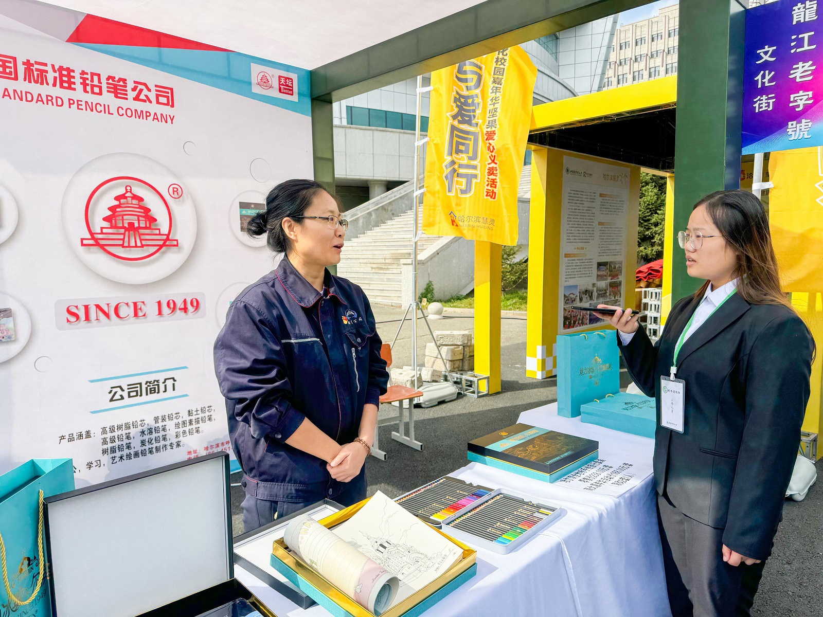 在现场参观的时候,我注意到很多同学都被“天坛牌”48色彩色铅笔和手绘旅行日记所吸引,纷纷上前试用。“天坛”铅笔承载着许多人的童年记忆,从萌芽学字到现在的日常学习,给了我们高品质的书写体验。学校举办此次商业文化校园嘉年华活动,使我们作为商业大学的学生,更加深入地了解了我们的本土品牌和文化。像“天坛牌”铅笔这样的“老字号”品牌,不仅承载着历史的记忆,更在不断创新中焕发着新的活力。希望学校能够更多的举办此类活动,为我们广大学子提供更多这样的机会与平台,近距离地接触、深入了解并亲身感受这些龙江品牌所蕴含的独特魅力与文化底蕴,从而增进我们对本土品牌的认知与喜爱,传承龙江商业文化的精神与内涵,激发我们的创新创意热情,为未来的职业发展奠定坚实基础。