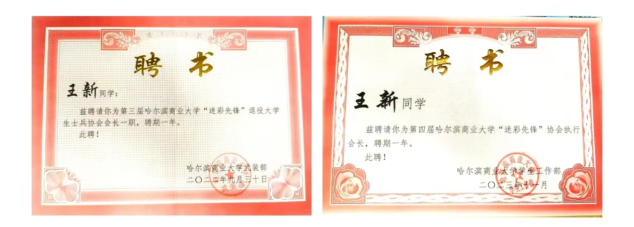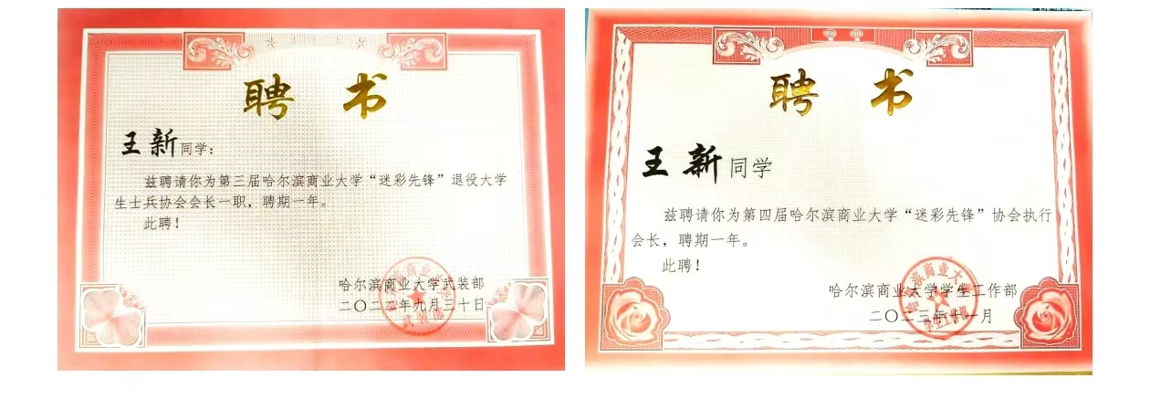在2023年9月再次被学校武装部聘为“迷彩先锋协会”执行会长