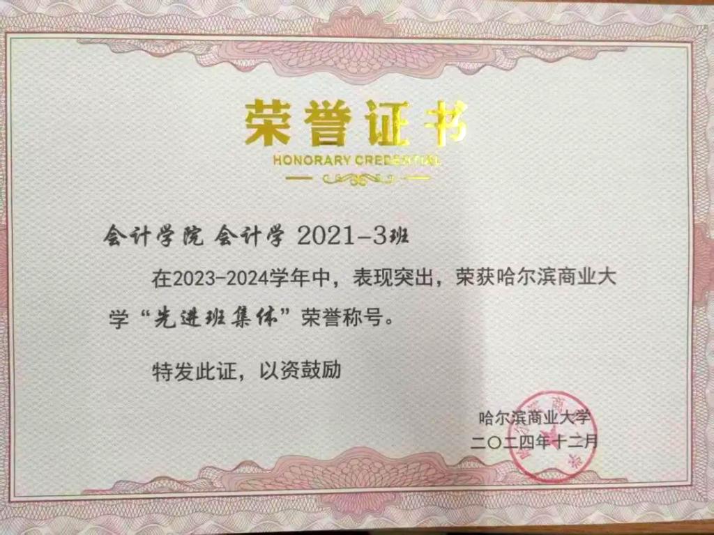所在班级荣获2023-2024学年“先进班集体”