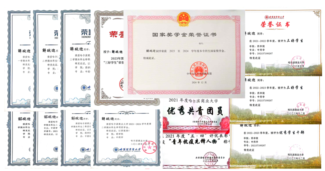 哈尔滨商业大学“三好学生”“优秀学生干部”等10余项荣誉